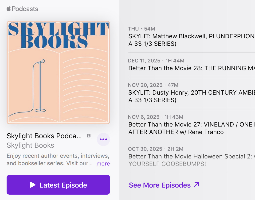 I will probably be including some material from the Skylight Books podcast, which I co-host and co-produce, too.